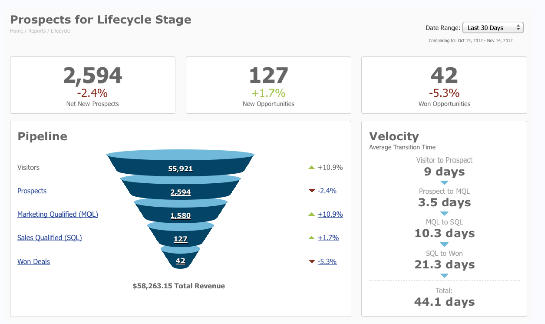 During your review meeting, you fire the dashboard and open the sales funnel for the last 30 days. You see that you have got 42 won deals which have a decent 5.3% conversion from SQL, and hover to the top to see a huge 2594 prospects with a 2.4% conversion from a large set of visitors.